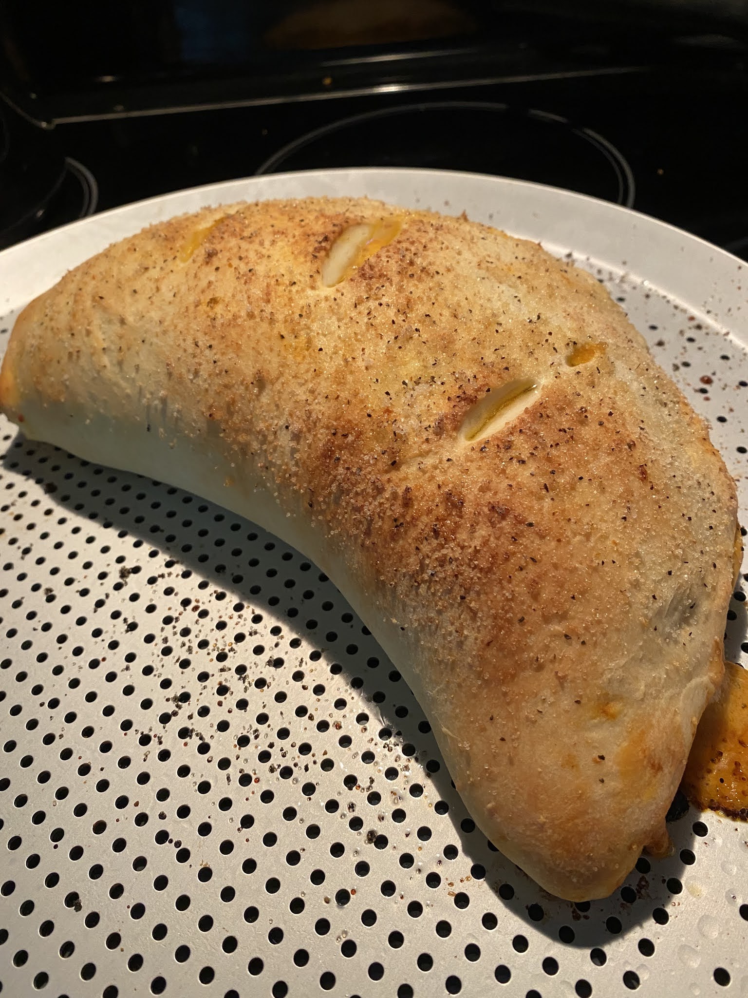 Place calzone on an oiled baking sheet or pizza slab and bake at 450-degrees for 15 minutes or until the top is browned. Remove and let sit for 5 minutes before slicing.