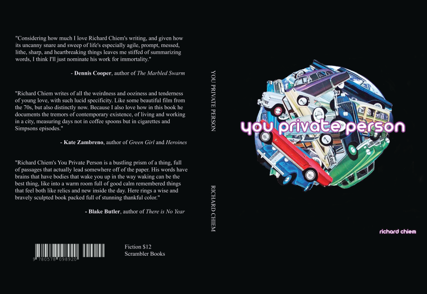the cover for YOU PRIVATE PERSON, my first collection of short stories forthcoming from Scrambler Books (2012), is now live. Designed by Mark Leidner. Much love and eternal gratitude to Mark. He is pure genius.