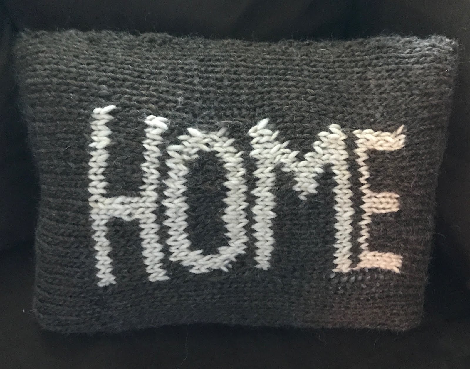This pillow has been a challenge to make, but I think it’ll make a nice addition to the house. It has the word “HOME” knitted into the fabric. Just think, everyone who visits will know this isn’t just a house, it is a HOME. The pillow says so.