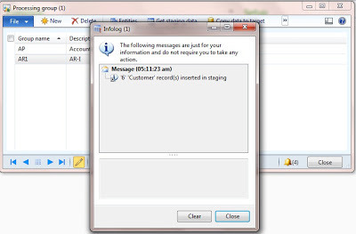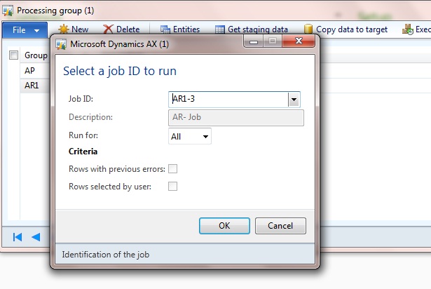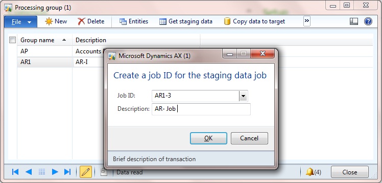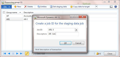 Click on Common->Processing Group, select the previously created group click Get Staging Data, system will ask for JobID to create a Job for running Staging Dataroutine. Provide an appropriate ID, Description and click "OK". See screen shot below: