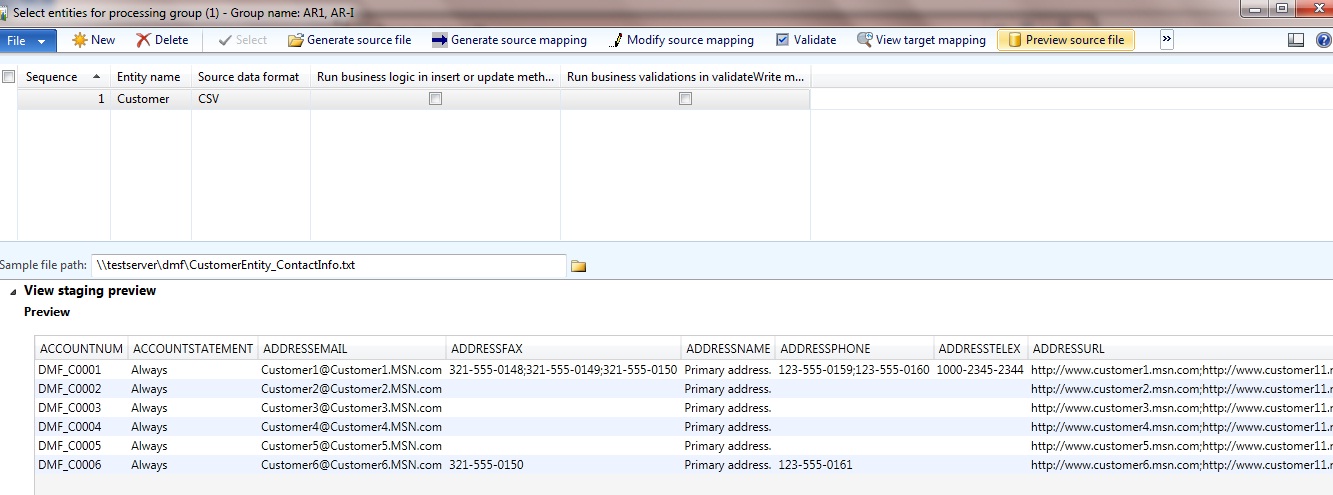 Preview Source DataClick on Preview Source file on entities screen, system will display data in preview grid for user checking. See Preview section on above screen shot with data populated in grid. Close the screen and go back to processing group screen to process further.