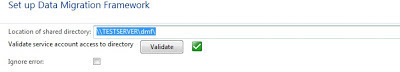 PROCESSING Setup shared directoryAn important first configuration is to provide Location of Shared Directory. Click Data Migration Framework->Setup->Data migration framework parameters. Provide the path to a shared directory and click Validate to let system verify the path. This directory will be used by DMF to put some files for internal use. User configuring the shared directory path must have Read/Write permission on the directory.