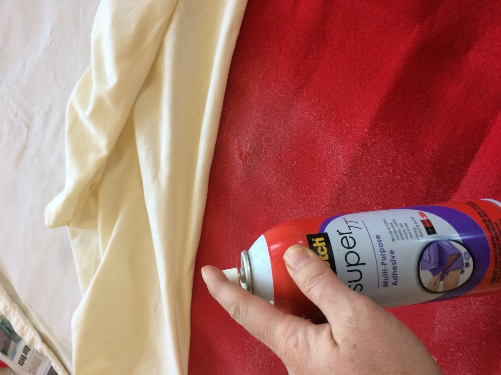 Using the felt tree skirt as a patter, cut out a circle from your sheet, leaving it about two inches bigger, so you can fold the edges over. Use a spray adhesive to stick the sheet to the felt tree skirt. Remember to fold the edges over and glue them too.