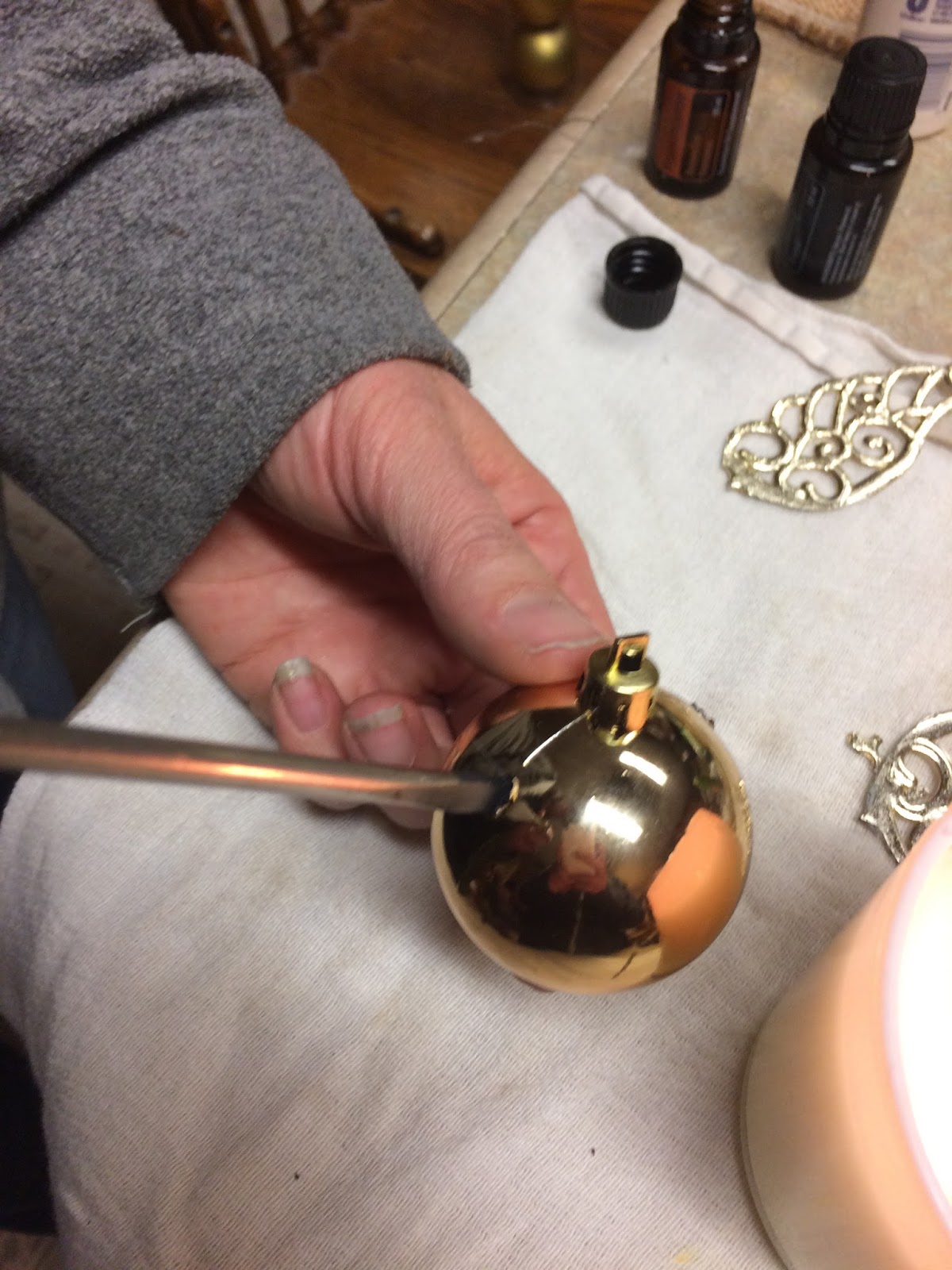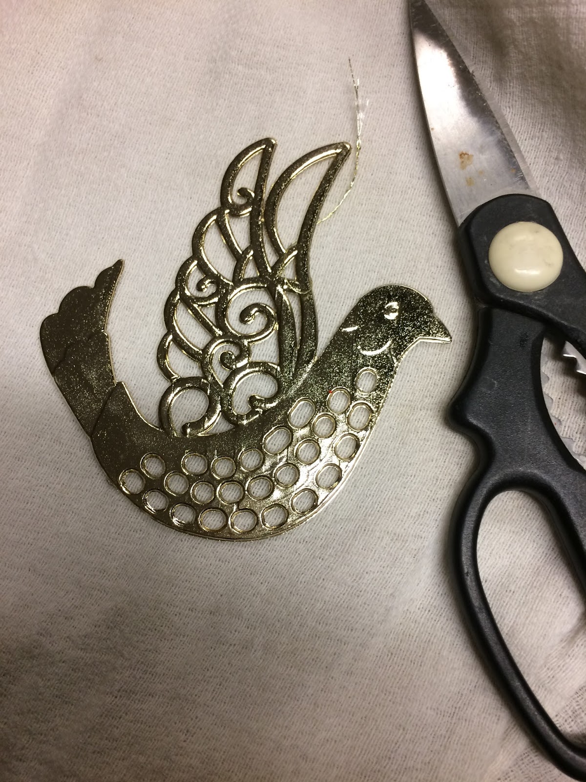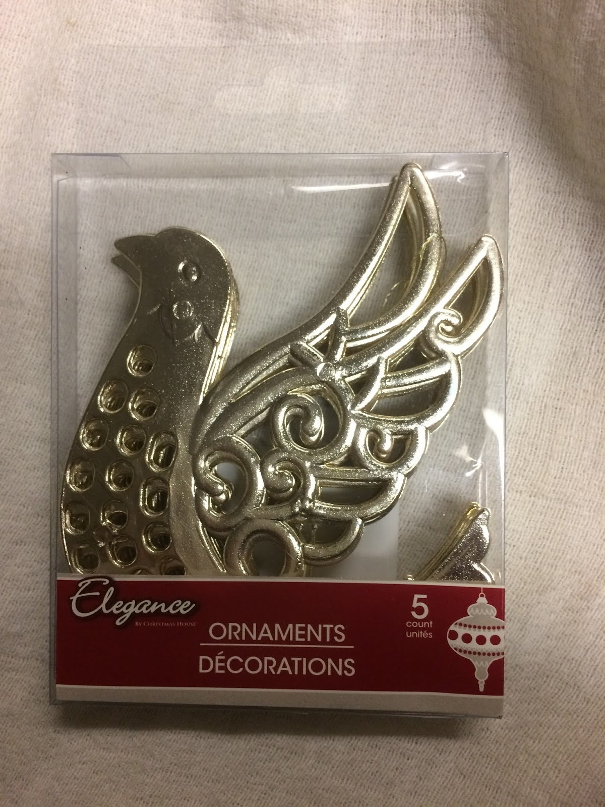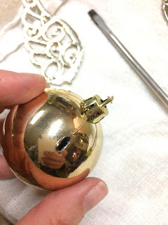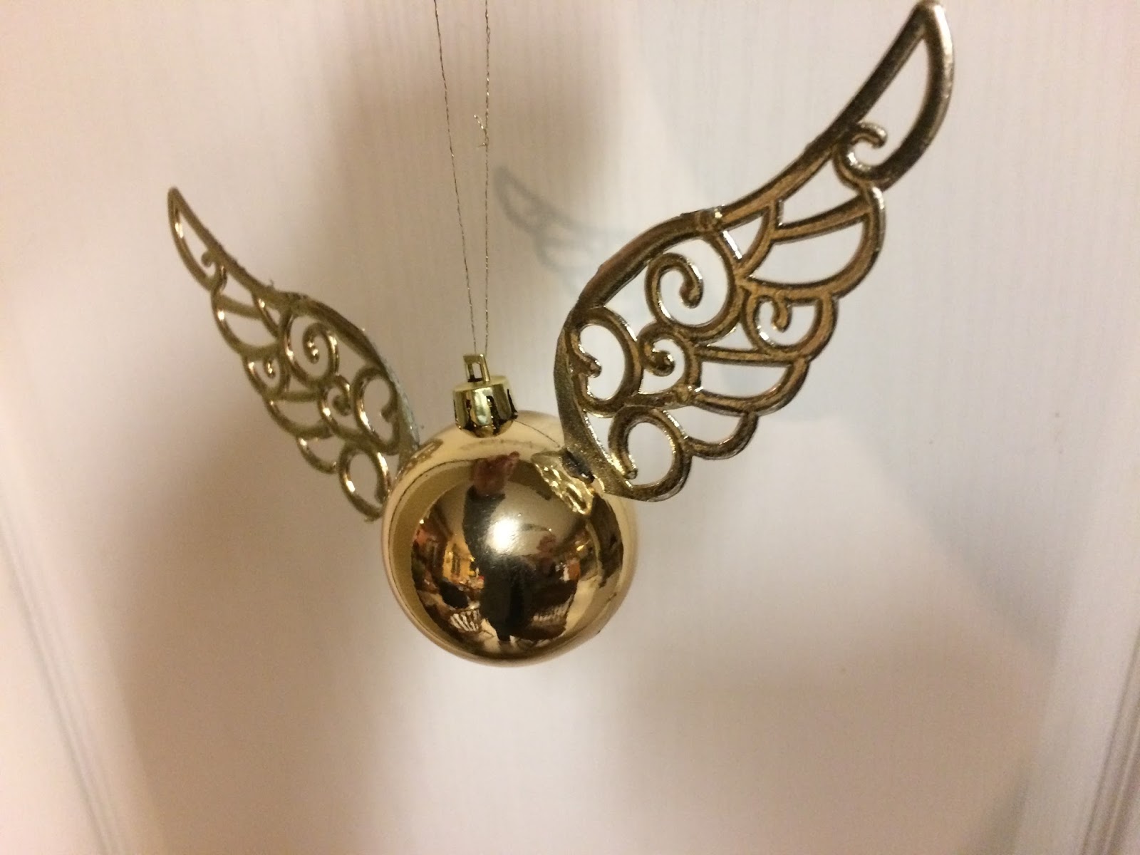 I bought 4 containers of 5 plastic bird ornaments (for the wings of the Snitch). Basically I walked into the store looking for anything that had wings, or something that could resemble the wings of a snitch. 4 packages was enough to make 10 snitches. I also bought a package of plastic, gold ornaments about the size of a golf ball. These came in packages of 12, so I had 2 left over that I just threw away.