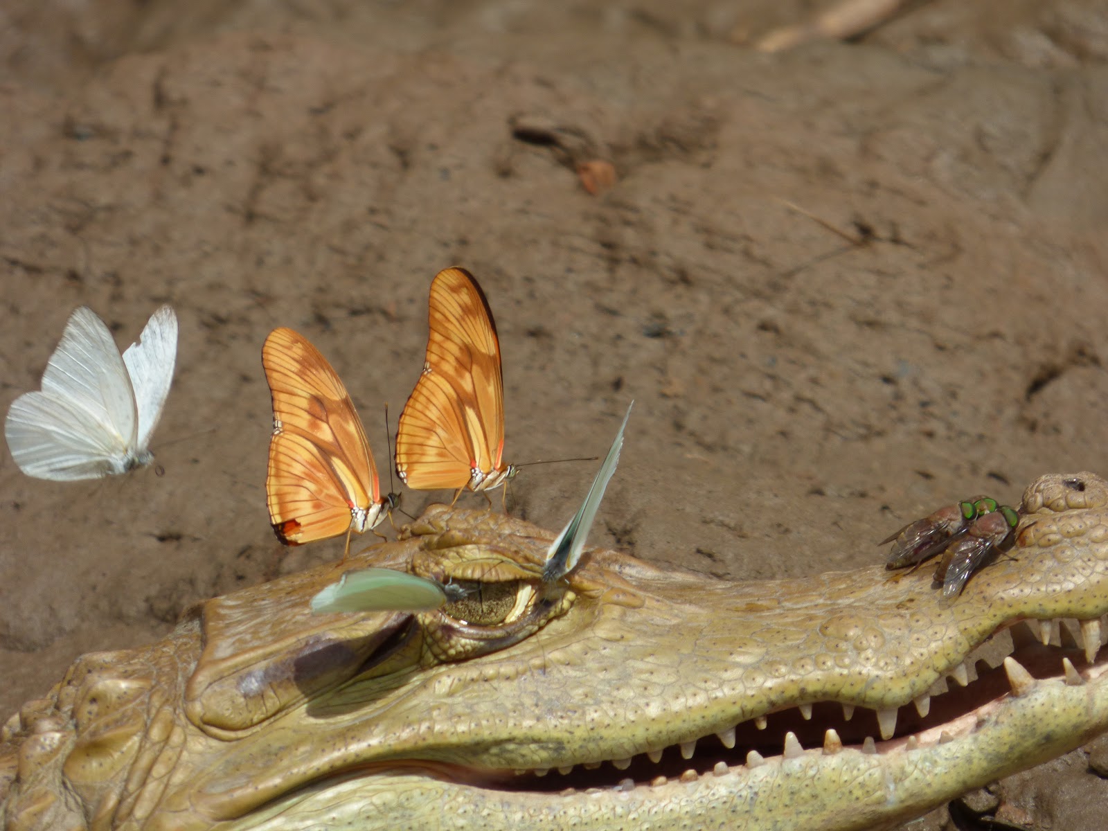 The clouding ones, that gather on the clay riverbanks to suck minerals, greeted us almost every time we walked the narrow plank off the boat and climbed the slippery mud steps then endless steep and rickety wooden steps up the sheer bank. What a contrast they made, with the dirt of the mud and leaf litter and their silky luminous colours. In my poem 'Black Caiman with Butterflies' in Mama Amazonica, butterflies are "the beauty of the world", but it's a beauty that needs to drink mud and caiman and turtle eyes, that, like the metallic morphos, must feed on rotting fruit.