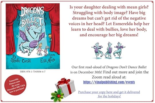 Purchase a copy of Dragons Don’t Dance Ballet and you get a free autographed Esmerelda Sticker to place in your book! Just send me your child’s name and your mailing address by email. You can buy a copy directly from the publisher, on Amazon, Barnes and Noble, my favorite independent book store or yours! I am also reading aloud using Zoom and I will have a craft for families to make! Join me on December 30th! Details below.