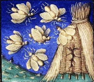 I love this portrayal of bees, showing them as bird-like. Medieval thinking considered bees to be small birds, not insects. I think the artist was influenced by this belief!SOMETIMES TRUE Bees are sometimes very aggressive and sometimes very easy to work with. Beekeepers will give you many reasons for this: storm coming, high winds, rain, dark colours, woollen clothes. Scent is very important to honeybees and they will kill their queen or each other if the smell is wrong. They do react badly to some perfumes and the venom in their stings gives off the scent of bananas, rousing other bees to attack. That's why the bees attack Mielitta in 'Queen of the Warrior Bees; she's wearing the banana scent delivered anonymously as her 18th year-cycle gift.