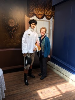 The majority of the 45 audiobooks I’ve recorded are Regency romance novels.Jannie: Going to boarding school in Bath, the home of stately Georgian and Regency architecture and culture, was a huge influence not only on the books I read in school, but also much later on the choice of novels I chose to record, which is why the majority of the 45 audiobooks I’ve recorded are Regency romance novels. During a recent visit to Bath I visited the Jane Austen Museum and here’s a photo of me with Mr. Darcy.