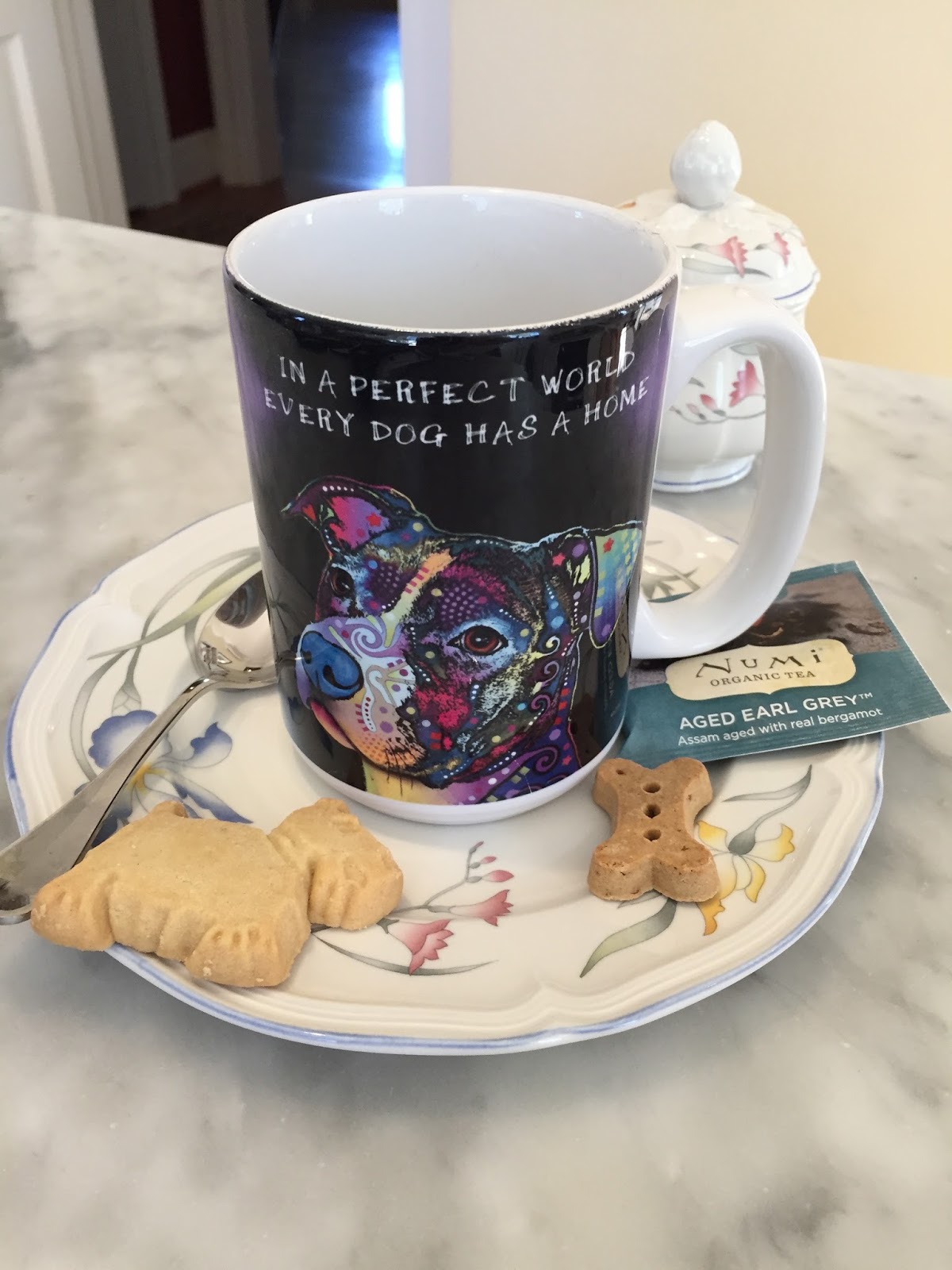 That’s her setup in the other photo at left. She prefers Earl Grey tea with sugar and cream and we usually leave her a cookie for herself and a treat to give Styles.