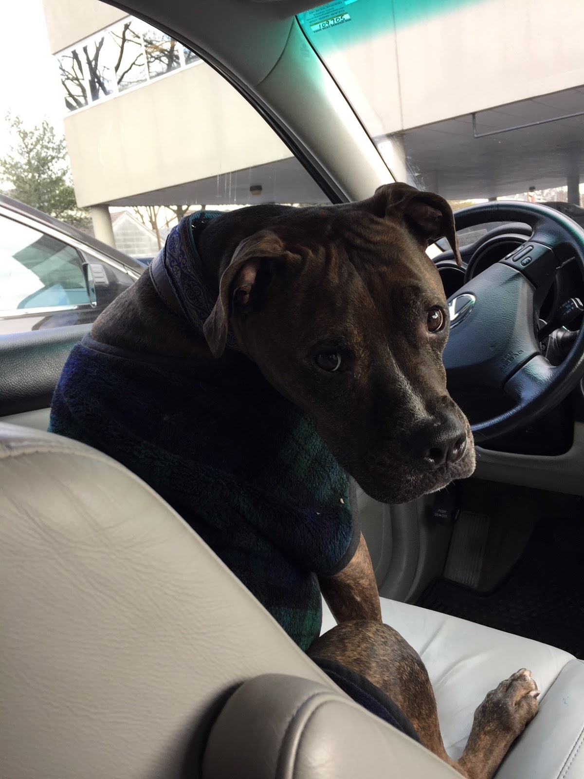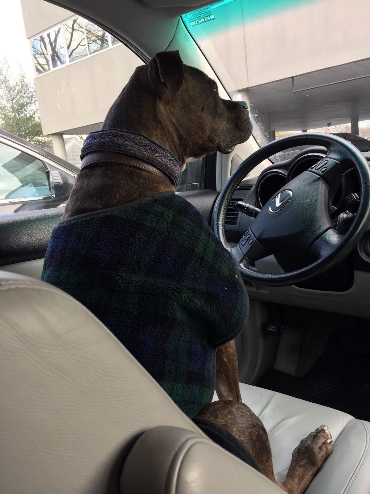 That’s his black watch plaid coat he’s wearing. It’s his favorite; he gets excited when I pull it out, and he sticks his head into the neck opening and waits for me to wrap the Velcro strap around his chest in anticipation of a trip or a walk.