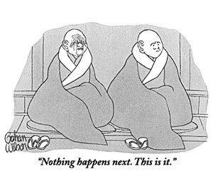 Finding stillness inside is about syncng up with the movement of the universe and moving WITH IT. Then, we can smile happily on the train and enjoy the ride. We can let go of needing to fixate on objects out the window and go with the flow. When the first monk tells the other that "this is it"- he's right.