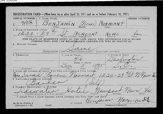 In between writing and taking pictures and everything else, I have managed to fit in a bit of genealogy research, a military registration card for the husband of my great, great-aunt. I suppose it’s something else I could include in a story. Imagine that…some sort of horror or science fiction story built around a found military registration card. Sounds good to me. I could set it at the Tidewater Hotel where my great, great-aunt’s husband worked as a barber. Maybe the story could start a little like this.