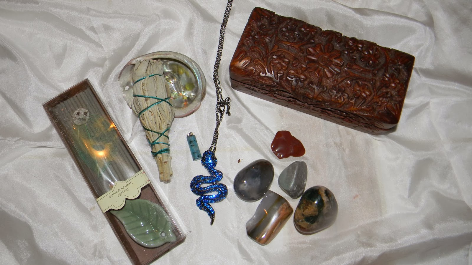 Smudge stick with abalone shell, snake necklace, tumbled stones, incense, natural stone pendant and wood trinket box. (US only)