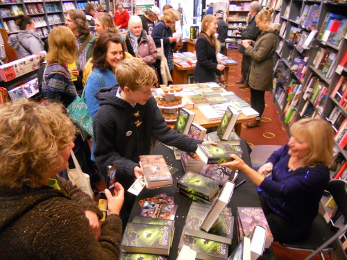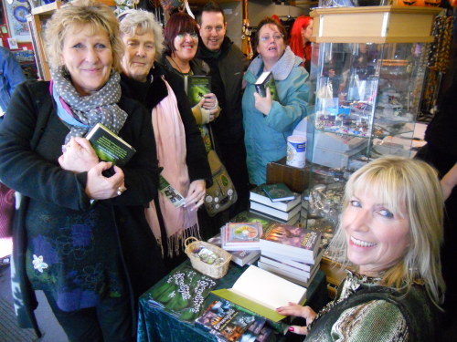 The Cat and Cauldron were well organised and had ordered in plenty of copies of Shaman of Stonewylde.  We brought along some ceremony cakes, badges and bookmarks, and before long, the shop was filling up!