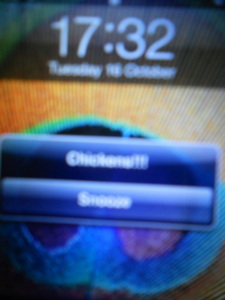 You probably can't read this - I took this photo of my phone-screen yesterday but it didn't come out very well.  The top line of the alert says "Chickens!!!".  This goes off every day, including Monday. Whilst the weight of everyone's disapproval crushed me, James made light of my dreadful faux pas with a kind comment about the bad timing of people's calls.     'No,' I muttered, horribly embarrassed and still scarlet with chagrin, 'it's not my phone going off.  That's my chicken alarm.'     'Chicken alarm?'      'It's to remind me to put the chickens to bed, so the foxes don't get them.'At this the room erupted into laughter and I didn't know where to look.     'Well are they alright?   Do you need to phone someone to ask if they can be put to bed?' asked James, rolling around in mirth.     'No, no!' I said.  'They're fine - I put them into their pen before I left.'