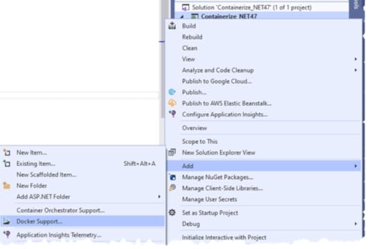 Adding Docker SupportOpen an old ASP.NET Framework 4.7 application or create a new one. Once open, right-click on the project name, select Add, and then Docker Support as shown in Figure 1.