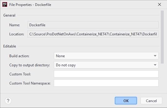 Containerizing ManuallyContainerizing an application manually requires several steps. You’ll need to create your Docker file and then coordinate the build of the application so that it works with the Docker file you created. We’ll start with those steps first, and we’ll do it using JetBrains Rider. The first thing you’ll need to do is to add a Docker file to your sample application, called Dockerfile. This file needs to be in the root of your active project directory. Once you have this added to the project, right-click the file to open the Properties window and change the Build action to None and the Copy to output directory to Do not copy as shown in Figure 6.