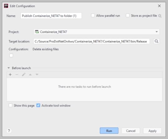 Figure 7. Selecting a publish directoryIt will be easiest if you select a directory underneath the project directory; we recommend within the bin directory so that the IDEs will tend to ignore it. Clicking the Run button will publish the app to the directory. The last step is to add one more command to the Dockerfile where you point the source command to the directory in which you published the application.