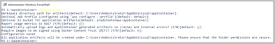 PS C:\App2Container> .\install.ps1You will see the script running through several checks and then present some terms and conditions text that will require you to respond with a y to continue. You will then be able to see the tool complete its installation.