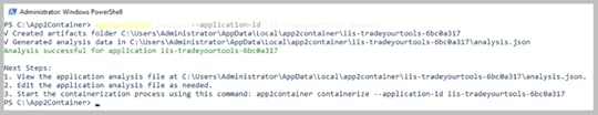 Figure 4. Output from running the App2Container analyze commandThe primary output from this analysis is the analysis.json file that is listed in the command output. Locating and opening that file will allow you to see the information that the tool gathered about the application, much of which is a capture of the IIS configuration for the site running your application. We won’t show the contents of the file here as it is several hundred lines long, however, much of the content of this file can be edited as you see necessary.