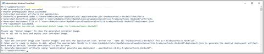Figure 5. Output from containerizing an application in App2ContainerAt this point, you are ready to deploy your container and can skip to the next article, “Deploying…”, if you don’t care about containerizing using server/worker mode.