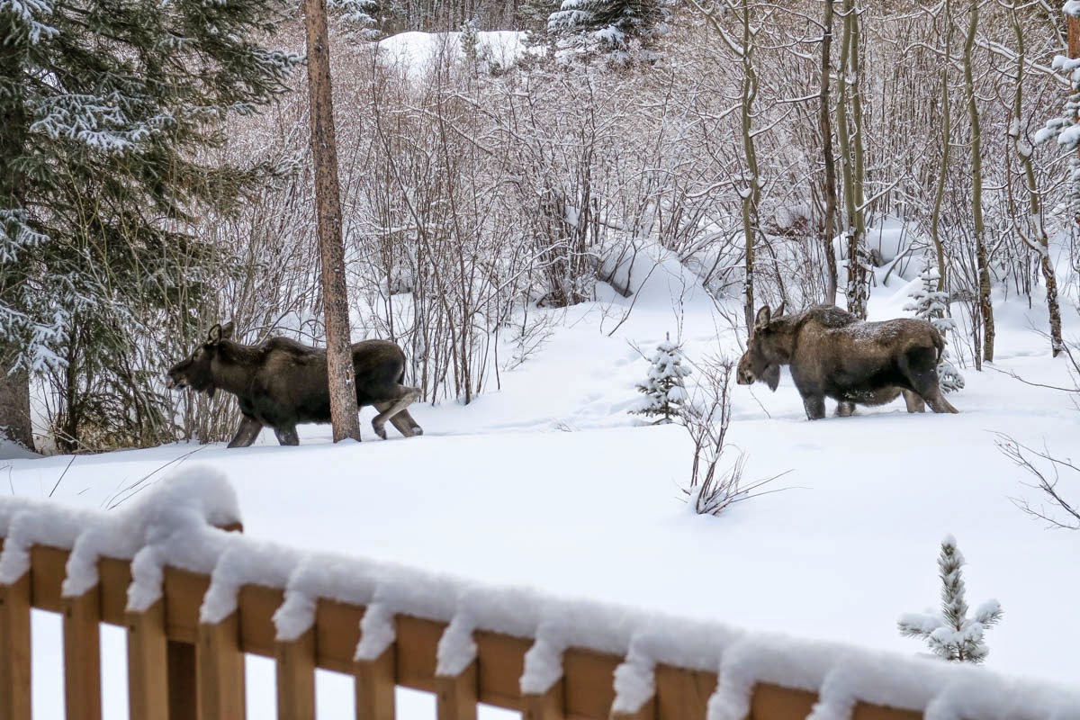 This morning my husband spied a couple of local moose standing on the road beside our house. They were looking up and down the road nervously, then decided to climb over the bank of snow left by the snowplow to plunge into the narrow wetlands behind the house. Below are a couple of photos that my husband snapped of them as they lumbered by.