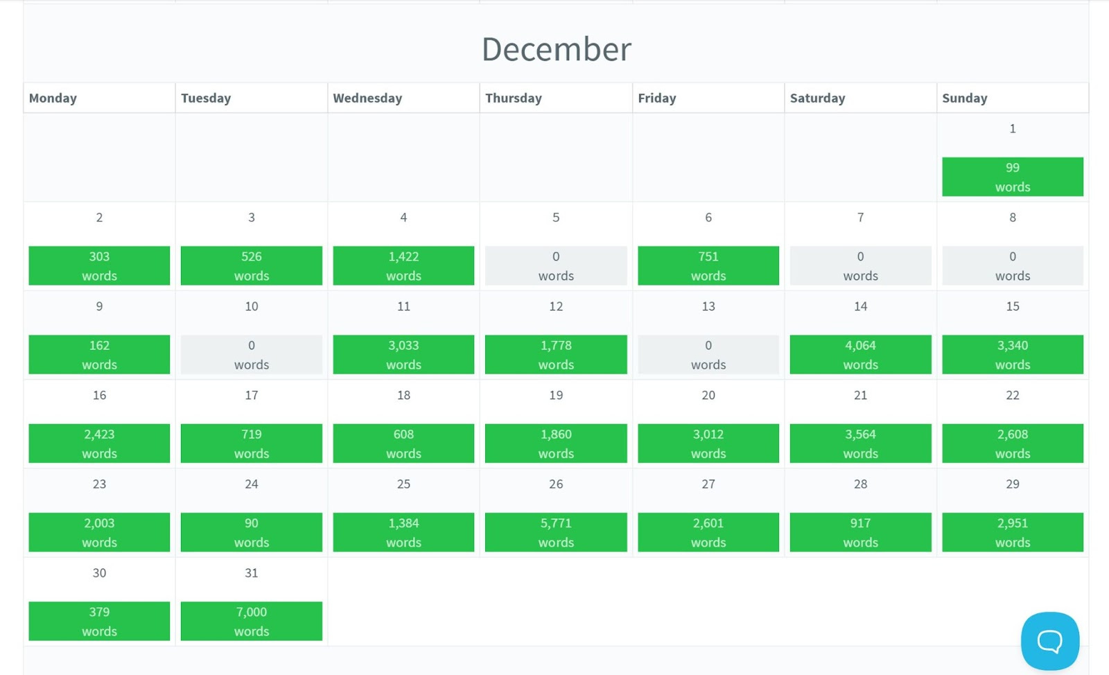 Fun fact, I also didn’t write most of November for a very specific reason. The US was in an election year, and so I promptly lost all creativity after our election was decided :)))) ANYWAY, I logged my WC daily so check out how I hit 70k in 7 weeks: