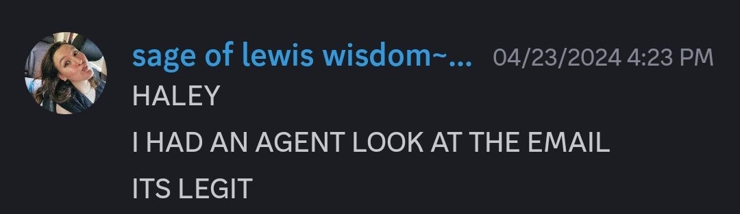 In the spring of 2024, a foreign rights editor at a big foreign publisher emailed me wanting to inquire about foreign rights for DOTT! My first reaction was “lol scam email of someone impersonating an editor smh” and I almost deleted the email. I didn’t though, and when I got home I reread it and realized… it doesn’t look like a scam. A quick Google search showed me that no one was reporting any impersonation scams was going on with this publisher or editor either. It started setting in that the DOTT interest I had that I laughed off as a scam was not a scam at all! So, I did what any rational writer does: I ran into my friend’s discord server we share and started screaming.