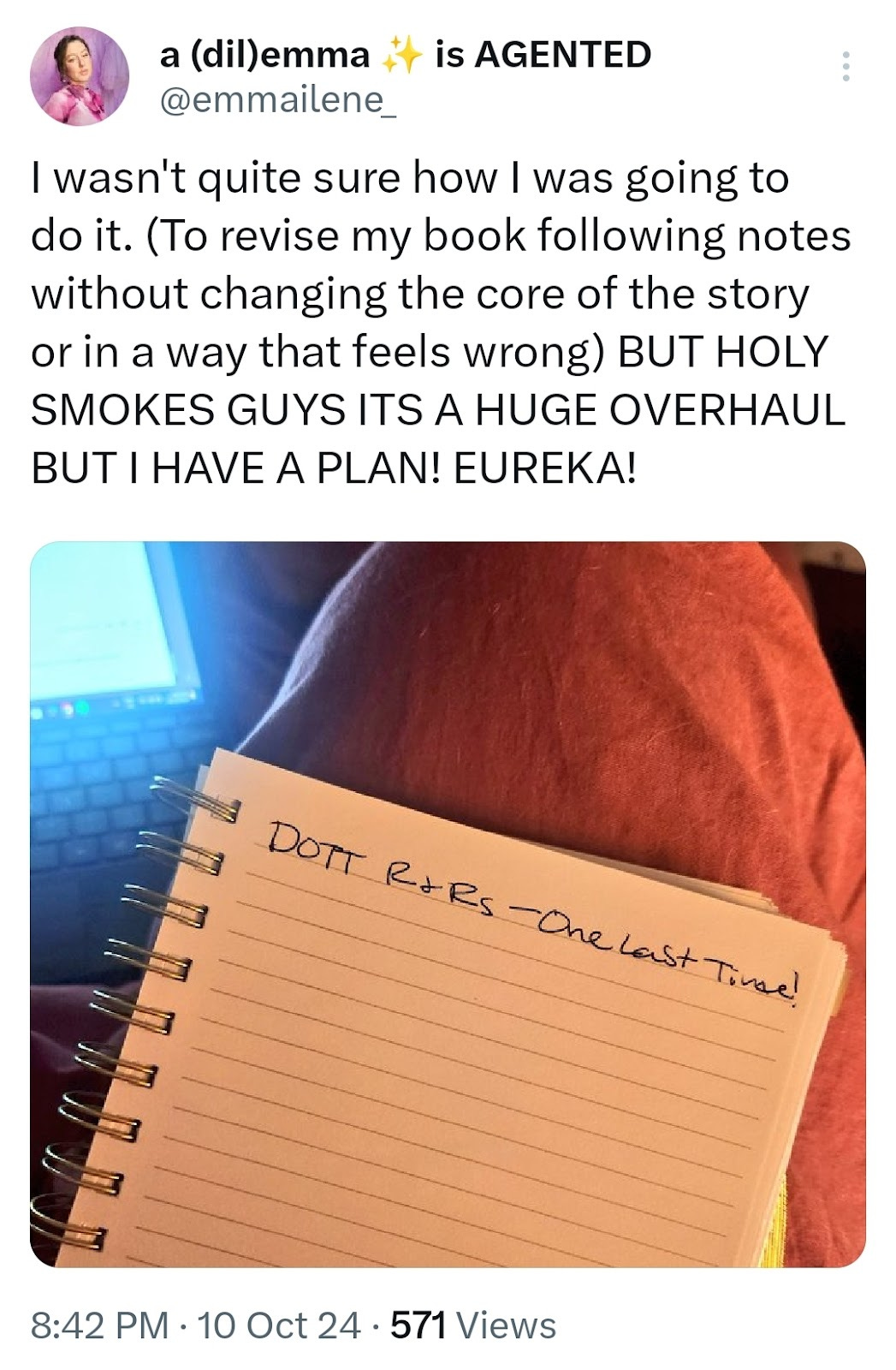 But, as soon as I hopped on the phone with Agent #3, we were cracking jokes, talking about edit ideas, and future wip ideas. The agent really understood the vibes I wanted to achieve for DOTT and the vision I had for it. It was all *chef’s kiss*. I will say it was a big gut feeling with this agent. I can’t really explain it other than I just felt like career-wise we meshed.