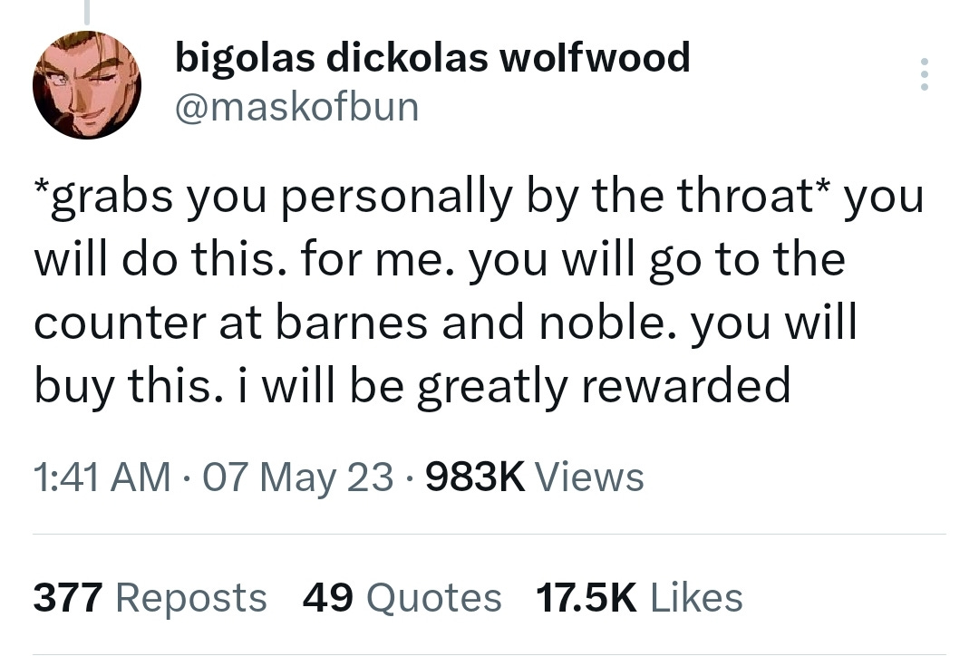 A follow-up tweet to Wolfwood’s original “review” where Wolfwood literally grabs consumers by the throat and says, “BUY IT!!!”After the tweet’s viral few weeks circulating the web, especially in the publishing and anime spheres, people continued to reference it. Even now, the original wording of the tweet is used by fans and creators to promote a piece of media they enjoyed. Those tweets receive hundreds to thousands of likes with the reference to the humor Bigolas Dickolas and Time War brought to these online spaces. Beyond that, Wolfwood didn’t just create a new internet joke for users to play off of but rather made people more conscious of marketing as a whole.