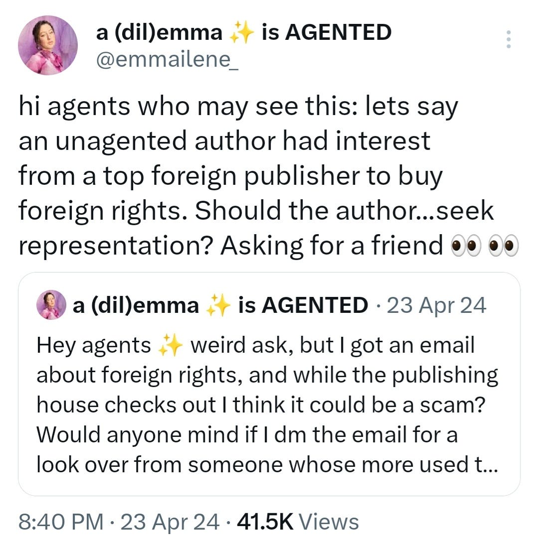 Foreign rights were something I had no idea about (or if that was wise to sell rights pre-publication) so I reached out to agents for advice on what to do with it. Funnily enough, I initially tweeted about it because I had absolutely ZERO idea who to ask, if it was okay to ask agents, or WHAT. So I tweeted it, and to my surprise, a lot of agented authors and agents reached out with help.