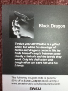 The following example is shown because of the discount. We all love discounts, and discounts are very effective in increasing sales. As you can see in the image, you can purchase the Black Dragon ebook for 50% with the provided code. What would make this even greater is if it was custom printed for a specific convention(but you have to keep costs in mind). For example if it read something like: