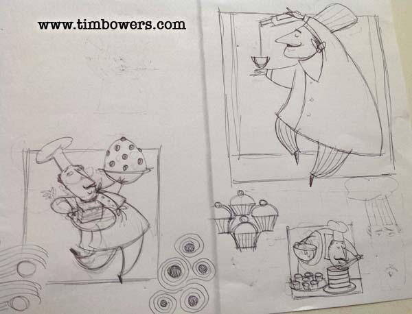 As usual, I start with some sketchbook ideas. Here is the pasta chef, the wine chef and the dessert chef in the early sketch phase.