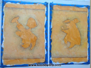 I tape the edges, gesso (with thick strokes using a large brush) the pieces of Bristol board and transfer the sketches onto the textured surface.