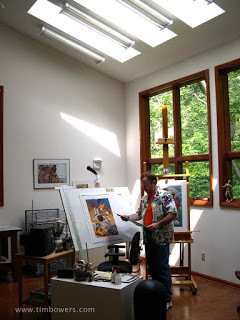 Twenty years ago, I decided to build an art studio. I was inspired by a drawing of Norman Rockwell's studio (in one of his books) and started with that basic idea. I wanted a great working space, tall ceilings, natural north light during the day and plenty of good lighting to use for the all-nighters. Lots of shelf space for books and storage for whatever else I picked up as inspiration.