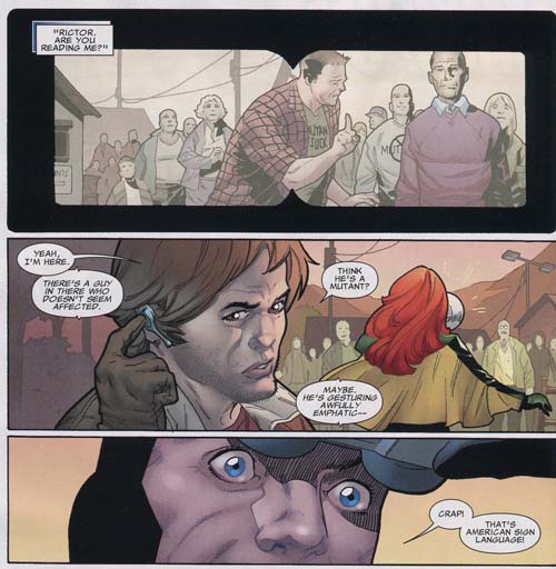 After Jamie Madrox is resurrected after his night of 1,000 deaths, him and Layla Miller embrace in a way that might make you blush. That was last issue. In this issue? It becomes apparent that Layla has become Jamie's new slam piece. And no, there's no nicer way I could have put that. As Madrox often does, he's having a whole internal debate about how wrong the whole thing was and blah, blah, blah. Jamie has been attracted to Layla ever since he went to the future and she was older babe. He needs to get over himself about this, and finally deal with his gross emotional problems. To her credit, Layla is having kind of the same thoughts re: regret. But she's a little bit more honest here, admits the whole Guido-no soul thing, and ... yeah, I'll admit it. I kind of want them to get together. And let's give it up to Peter David who somehow made me feel not icky about that. It's weird how Layla is becoming my favorite.Where's the team? Madrox asks. This is when Layla alludes to a change in leadership.