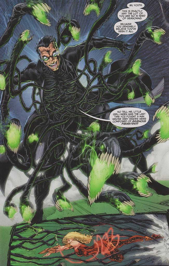 So they break into the base. In an odd timing issue, Wonder Girl (don’t call her that!) has already fought Ravager which... how? How can the end of a Superboy issue point to a Titans issue which points to the next Superboy issue having happened already? Oh damn. Just give myself a massive headache. Moving on. Rose Wilson is defeated. Now Cassie is fighting some dude with parasitic tendrils coming out the back of him. It’s super gross.