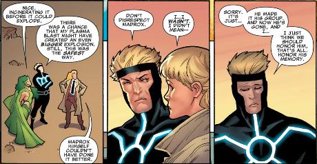 There's a brief discussion between Val and Havok with some of the other team members chiming in about Madrox. Havok seems much less of a jerkface than he used to be and kind of misses his old multiple buddy. But I think Alex needs to remember than Jamie didn't talk for a long time then seemingly died from the Legacy Virus. The Multiple Man of the 2000's is much more chatty, and I feel like they might butt heads. All of this is speculation; this issue is just to present not only a fun action sequence, but that the team can function without Jamie's leadership at the helm of someone else. I mean, readers could have guessed that before now (Jamie has been absent before), but it's quite another thing to see it actually happening. Can't wait for the next issue though.