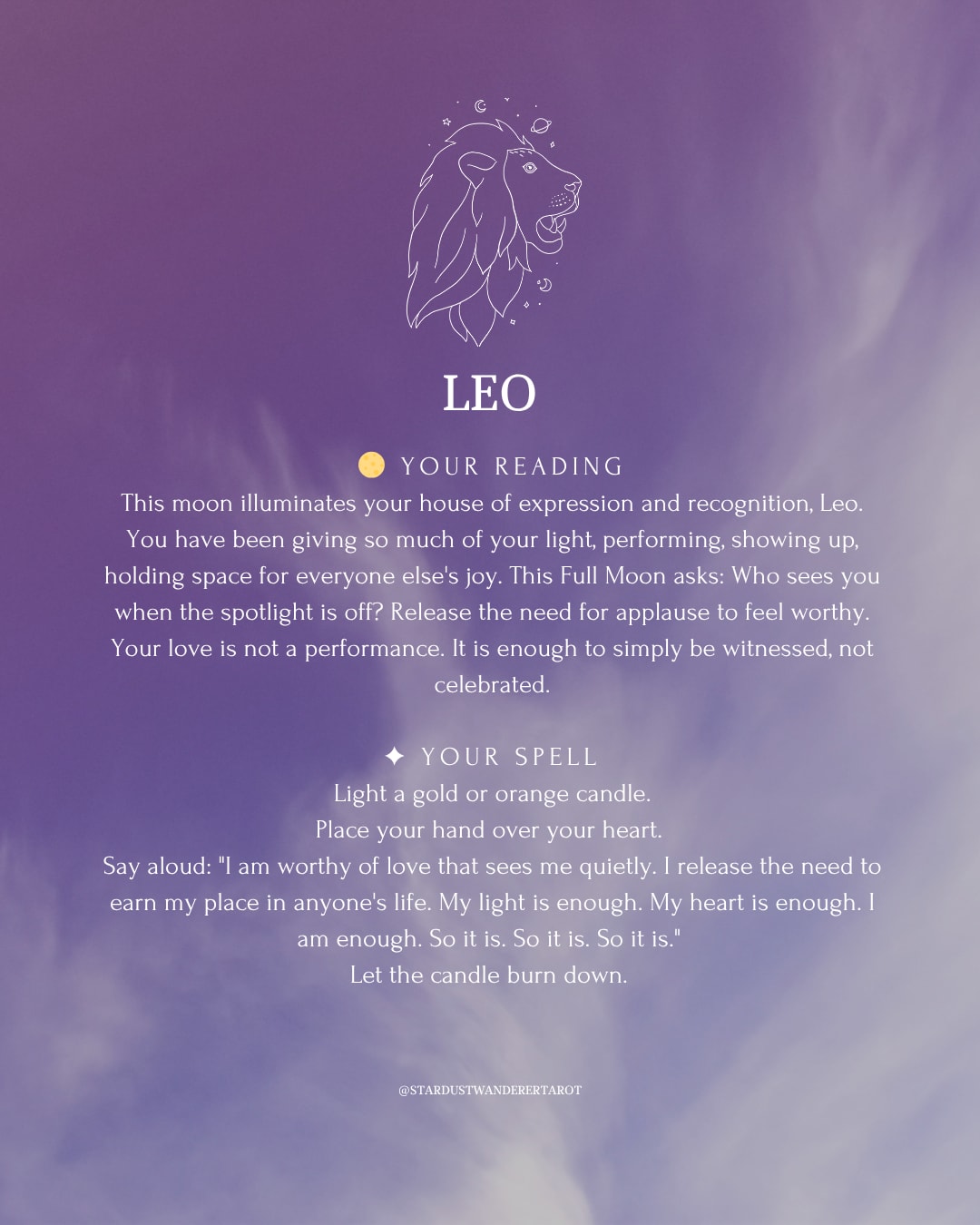As the Moon begins to release her fullness, Leo asks you to soften your grip on performance, validation, the need to be seen a certain way, and leaning into ego.
