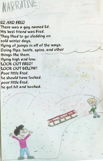 There was a guy named Ed.His best friend was Fred.they liked to go sledding oncold winter days,flying [off] jumps in all of the ways.Doing flips, twirls, spins, and otherthings like them,flying high and low.LOOK OUT FRED!LOOK OUT BELOW!Poor little fred,he should have looked,poor little Fred,he got hit and booked.