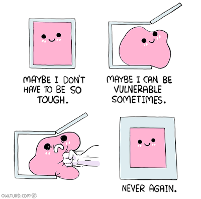 This was/sometimes-still-is me. Hardened exterior to protect my squishy, amorphous blob of emotions and feelings. But let's face it: men have feelings too. We just do. And yet, for decades like most males, I hid. Because I was supposed to. Because it was easy—you can't get hurt if you keep yourself from being exposed and vulnerable to any possible disappoint or failure. Unfortunately, living as such also keeps you from growing, which in turns ends up hurting in a variety of more complex and detrimental ways.