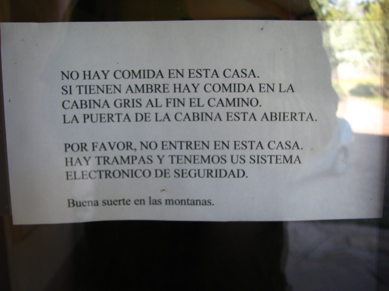 There is no food in the house.  If you all are hungry, there is food in the cabin at the end of the road.  The door to the cabin is open.  Please, do not enter the house.  There are traps and we have an electronic security system.  Good luck in the mountains.