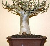 This little baobab tree is in a “training” pot made of plastic. Training includes regular root and branch trimming, and when necessary, wiring of the branches to make the tree look like the sculpture you want. When it is bigger and more well established, training will begin, and eventually it will be transferred to a larger and deeper ceramic pot where it will live permanently.