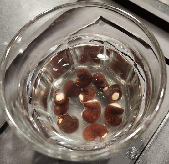 The process of getting the seed started is complicated, as the seeds of the Bonsai are as strange as the tree itself. Each seed has a black, thick, hard coat surrounded by a second softer brown coat. It takes a long time for the seed embryo to work its way out of the outer hard coat to germinate, months and months, and only when the conditions are just right. This is too long a wait for most people to tolerate for a specimen tree, so a way was found to force germination much more quickly. The process requires soaking the seeds for three days in a glass of water, then filing or cutting the seed coats back on one end until you can see a small sliver of the white seed embryo. Then you put it back in a glass of water for 2-3 days during which time the seed will swell and soften from within, thanks to the hole in its coat. Below is a photo of my soaking Baobab seeds. I used a Craftsman wire cutter to nip off the seed coat to expose the white seed interior before putting them in water. They began to swell quickly, and after two days they were ready to peel, using my thumbnails. Quite easy, really.