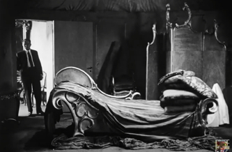 There’s this one image that sticks with me. Dr. Mabuse stands in the doorway of a darkened room. We can just see the outline in the foreground of…something. Then he switches on the light and you see a marvelous, opulent Art Nouveau bed. It looks like a sleigh that might carry a load of baby Cupids. It’s a fantastic scene and I WANT THAT BED!!!