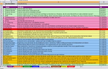 Zum einen wäre da die Szenenübersicht, die ich bereits zur Planung verwendet habe (oben ist ein Bild von dem Plan). Diese passe ich ständig an den aktuellen Stand an, da ich durchaus auch mal Änderungen vornehme oder feststelle, dass aus einer Szene doch zwei werden.