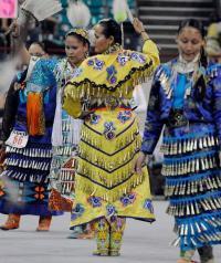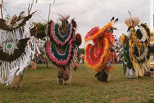 Down below, I've added a photo of some young Fancy Dancers—like Delsyn tried to be despite his illness. You only see them from the back, their beautiful double bustles, and one of a Jingle Dress Dancer. Jingle Dress is my favorite among the women's pow wow dances, and when Sonny's mother was young, she danced that style.
