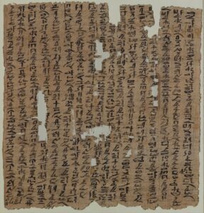 The earliest extant piece of papyrus is a blank scroll from around 2900 BCE.The first examples with text date from about 2500 BCE, which is about the same period as the earliest known statue of a scribe.Although paper is the best known use of the papyrus plant, ancient Egypts, also used it to make small boats, mats, boxes, baskets, sandals, and ropes, similar to the way birch bark was used in North America.Papyrus could be erased and reused.