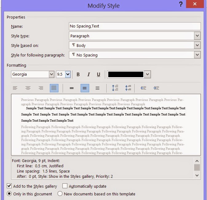 With the exception of the chapter titles, I will be using the Text style for pretty much all of my document. When I start typing, I make sure that the Text style is active (just click on it). You can apply it to existing text by highlighting the paragraphs you want and then clicking the "Text" style. This will change all selected text to the parameters within your style. Here is an example of my "Text" style and you can make changes by right-clicking on the style and choosing "modify":