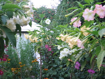 Brugmansia have spectacular, trupet-shaped blooms